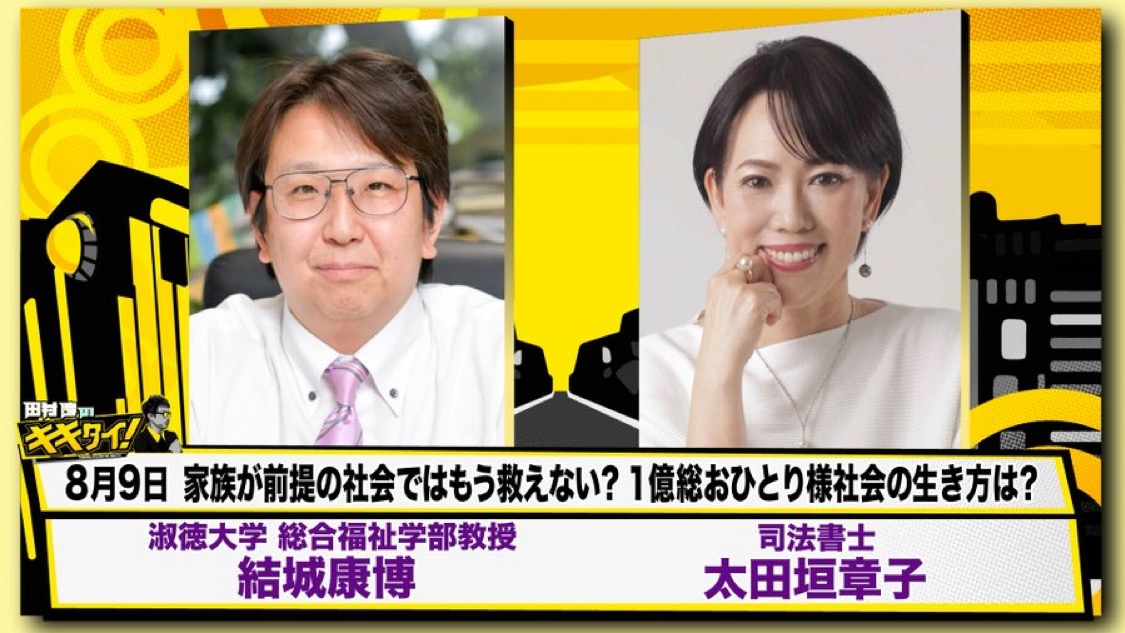 田村淳のキキタイ!【TOKYO MX9ch】ゲスト出演 2025 8/05 お知らせ 2025年8月5日 8月9日17時からの生放送 出演します。テーマは家族が前提の社会ではもう救えない?1億総おひとりさま社会の生き方は?生放送は緊張しますが、一生懸命にお伝えしてきますね。ぜひご覧ください。 お知らせ よかったらシェアしてね! URLをコピーしました! URLをコピーしました! Always Happy FM横浜「Lovely Day」ゲスト出演! 関連記事 産経新聞に掲載されました 2026年2月22日 TOKYO FM Blue Ocean ゲスト出演 2026年2月12日 TBSひるおび に出演! 2026年1月17日 旬感LIVEとれたてっ! にゲスト出演 2025年11月25日 田村淳のキキタイ! にゲスト出演 2025年11月23日 田村淳のキキタイ! 10月22日ゲスト出演 2025年11月21日 新書発売! 2025年11月17日 公益財団法人 日本賃貸住宅管理協会青森県支部 2025年11月5日 コメント コメントする コメントをキャンセルコメント ※ 名前 ※ メール ※ サイト 次回のコメントで使用するためブラウザーに自分の名前、メールアドレス、サイトを保存する。 上に表示された文字を入力してください。 Δ